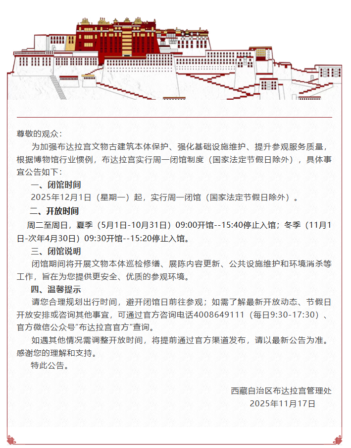 新京报11月17日,西藏自治区布达拉宫管理办公室宣布,布达拉宫周一闭馆。详细信息如下。为加强布达拉宫文物古建筑保护,加强基础设施建设,提高对游客的服务质量,按照博物馆行业惯例,布达拉宫每周一闭馆(节假日除外)。具体事项我们将通知如下。一、闭馆时间 2025年12月1日(星期一)起布达拉宫每周一(节假日除外)闭馆。 2. 营业时间为周二至周日。营业时间为上午 9:00 至下午 3:40。夏季(5 月 1 日至 10 月 31 日)以及上午 9:30 至下午 3:20冬季(11月1日至次年4月30日)。三、关闭详情 关闭期间,为提供更好、更安全的参观环境,文化将对物业物业进行检查维修、更新展览内容、维护公共设施、进行环境消毒等。 4、注意:请合理规划出行时间,避免节假日参观。如想了解最新开园信息、节假日开园安排等事宜,可通过官方咨询热线4008649111(每日上午9:30至下午5:30)和官方微信公众号“布达拉宫官方”联系我们。若因其他情况需要更改营业时间,我们将通过官方渠道提前通知您。查看最新信息。感谢您的理解和支持。这是公告。编辑 申真